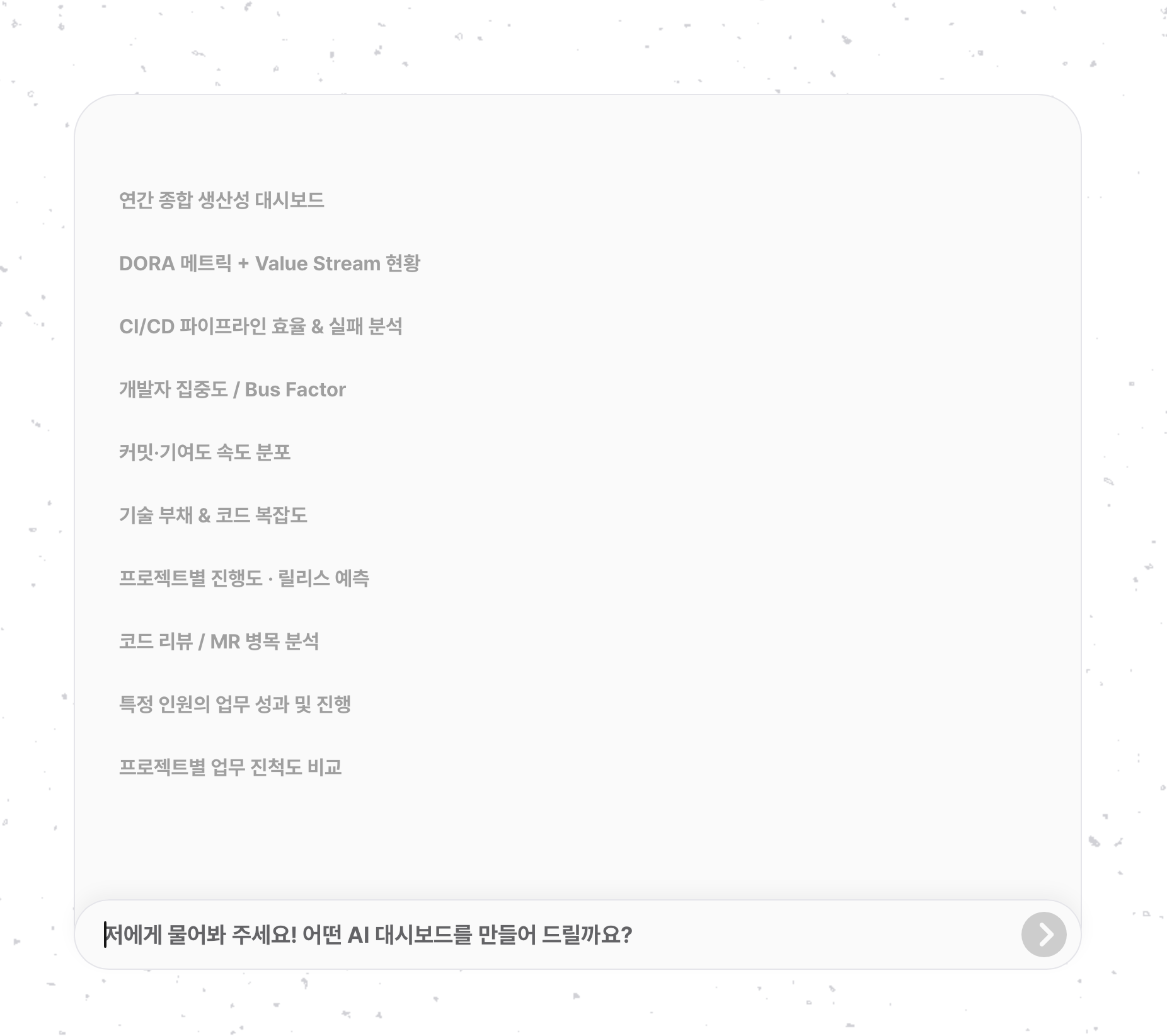 초기 화면에서는 다음과 같은 추천 질문이 표시됩니다. 클릭하면 해당 분석이 바로 시작됩니다.